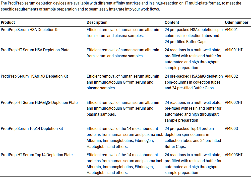 ProtiPrep is your solution for efficient and rapid removal of human albumin and other highly abundant proteins from serum and plasma samples. Albumin, Immunoglobulins and other proteins, which make up most of total serum protein, can mask less abundant proteins in proteomic analysis. With ProtiPrep you optimize sample preparation and enable the detection of less abundant proteins by mass spectrometry and electrophoretic methods.